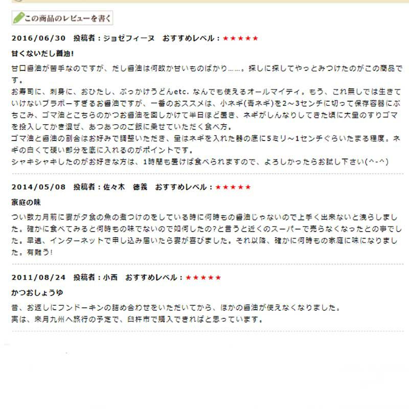 他の画像を見る まろやかな風味を持つ本醸造丸大豆しょうゆに、本かつおのうまみを加えただししょうゆです 。 丸大豆かつおしょうゆ 200ml密封ボトル 販売価格 ¥ 362 税込 カートに入れる お気に入りに登録する